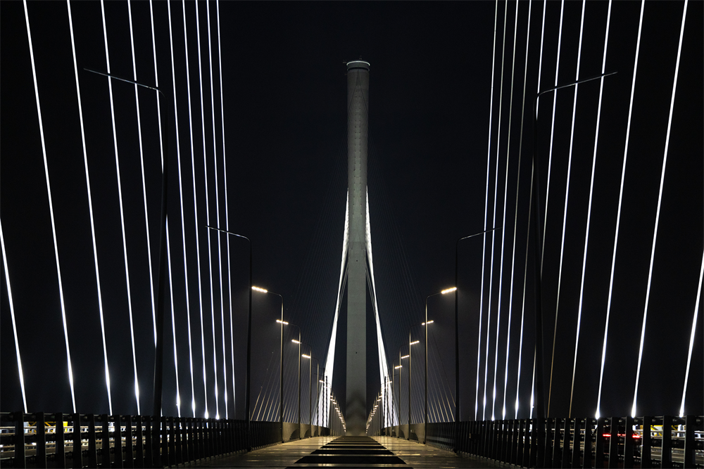 作为总体设计单位,公规院在黄茅海通道项目设计过程中对地域和人文环境进行调研,综合考虑索塔阻水、防撞、风阻、风振等力学作用因素,在国际上首次提出了“小蛮腰”造型的变截面独柱塔,五座索塔风格一致,实现了力学与美学的和谐统一。